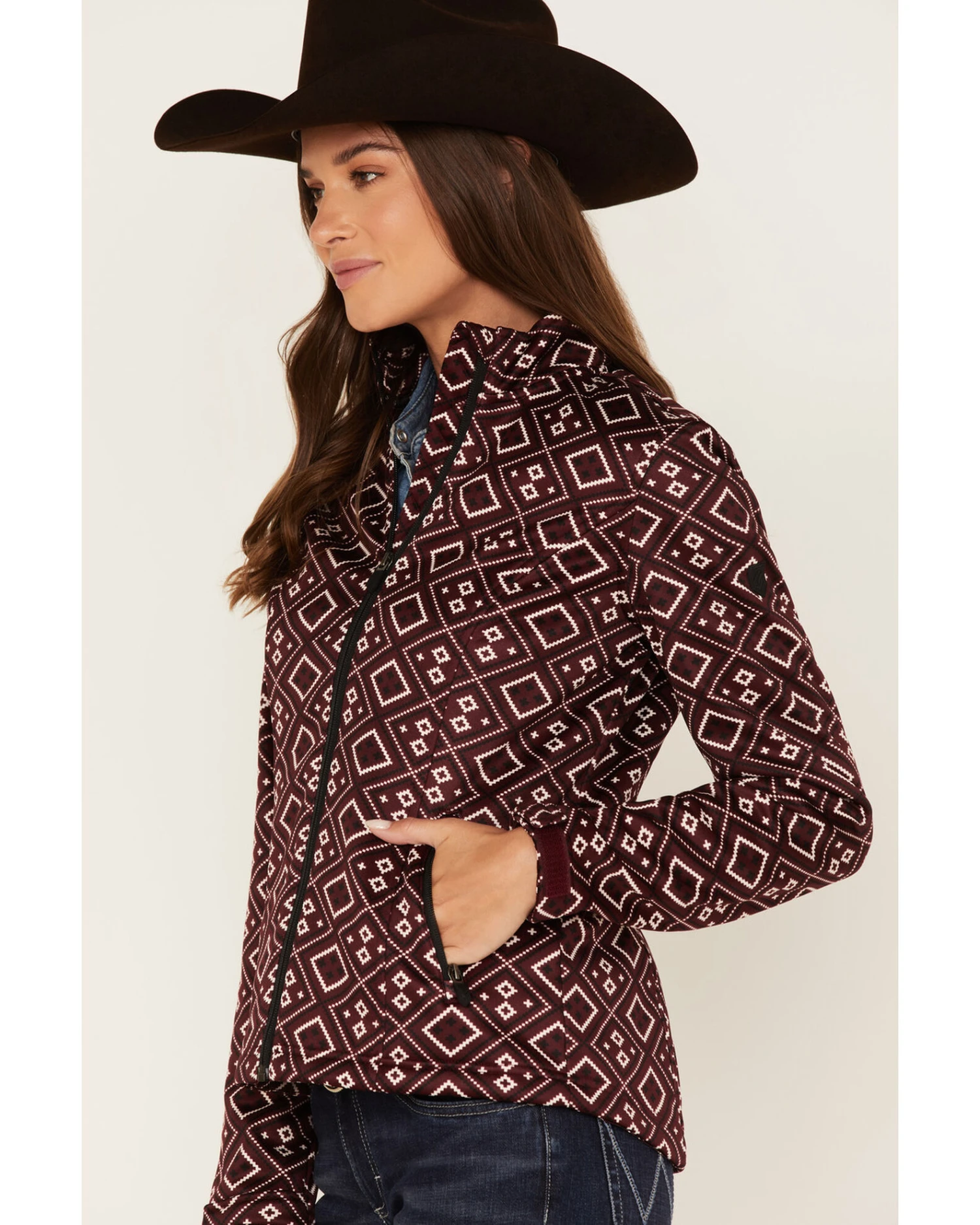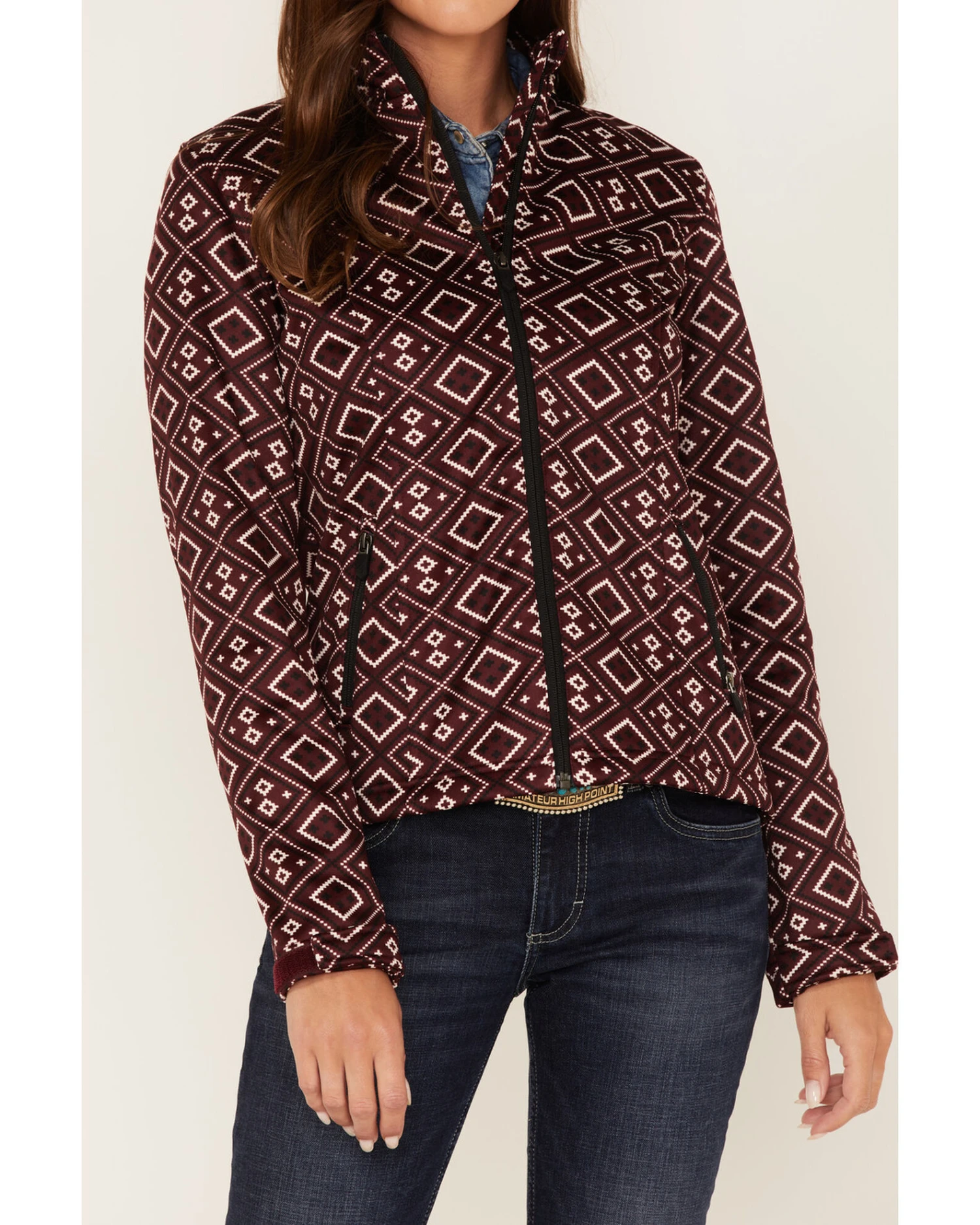 - Burgundy with allover black and white geo Southwestern print