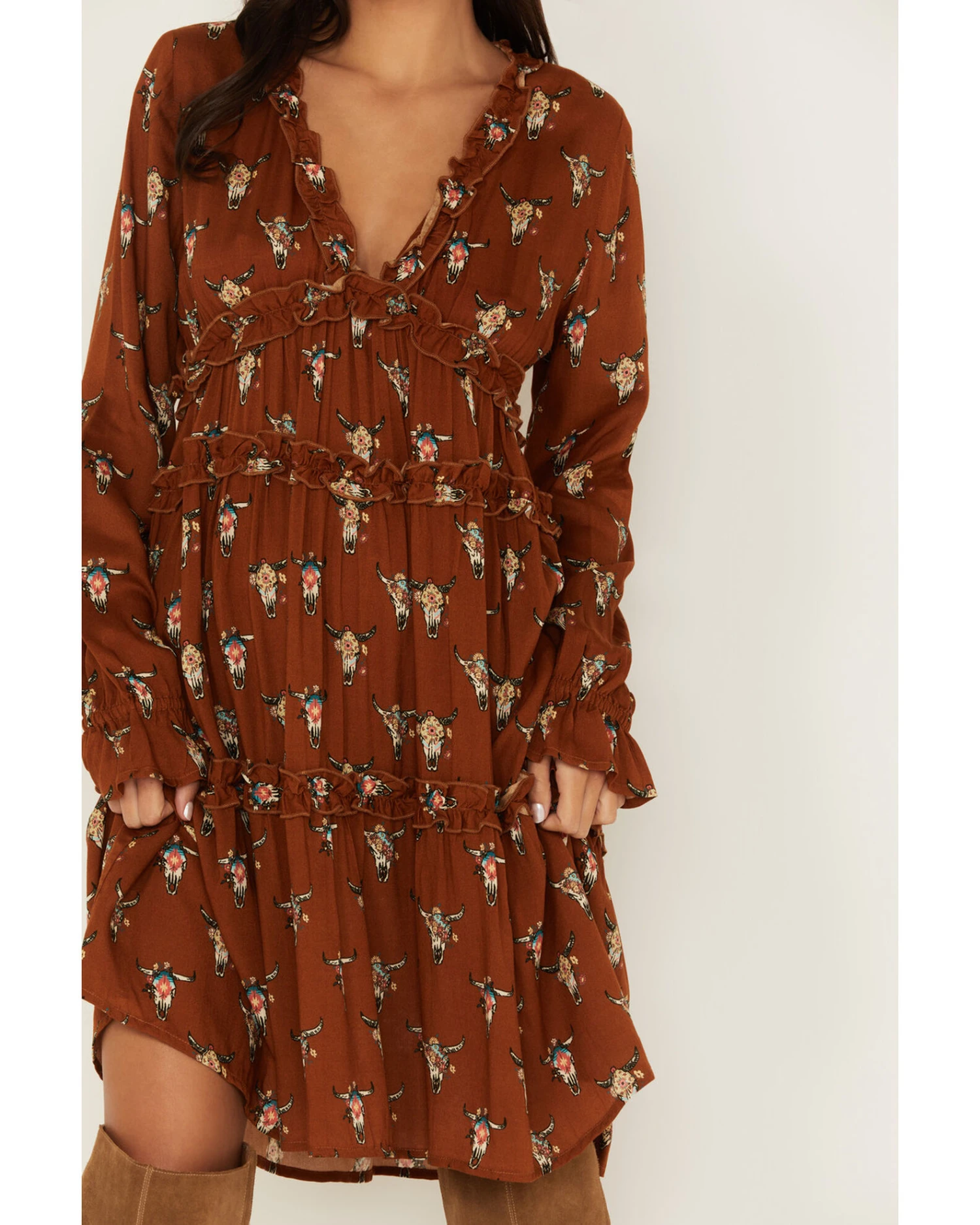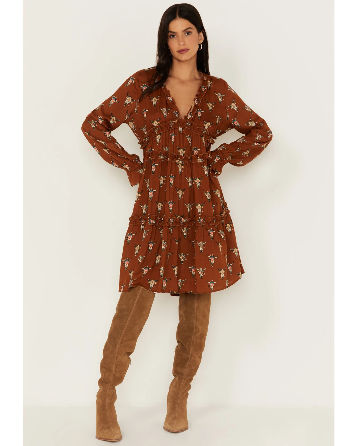 Roper Women’s Cowskull Print Long Sleeve Tier Dress