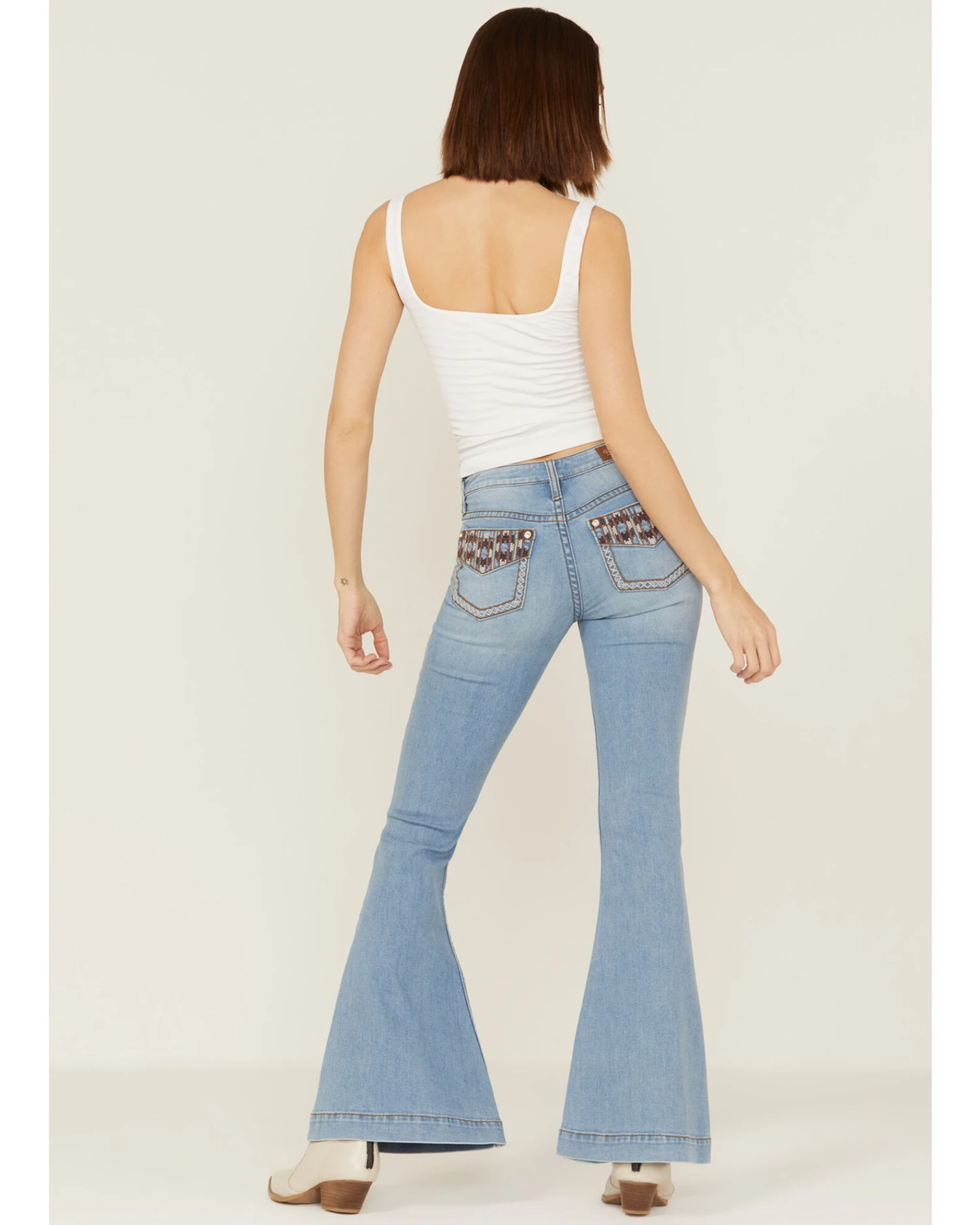 - Embroidered Southwestern pattern back flap pockets
